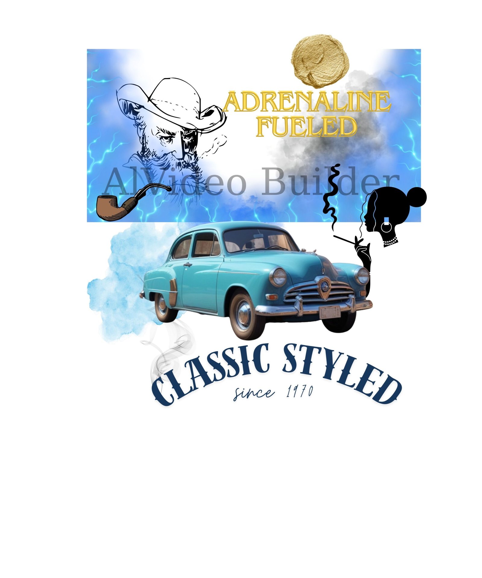 Görsel, retro ve modern dinamizmi harmanlayan eklektik bir sanat stilini benimsiyor. Klasik otomobilin fotoğraf gerçekçiliği, tasarımın vintage ruhunu vurgularken, üst kısımdaki şimşek efektleri ve soyut bulut dokuları modern, enerjik bir atmosfer katıyor. Pipolu figürün çizgi sanatı, tasarıma nostaljik ve “cool” bir dokunuş eklerken, altın rengi “Adrenaline Fueled” yazısı lüks ve dinamizm hissi uyandırıyor. Genel estetik, klasik zarafet ile hız ve heyecanı birleştiren, cesur ve maskülen bir duruş sergiliyor. Ancak, farklı öğelerin bir araya gelişi bazen bir kolaj hissi yaratabiliyor, bu da bütünsel bir hikaye anlatımını zayıflatabilir.